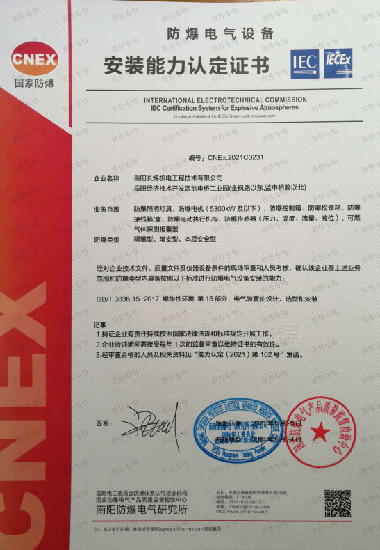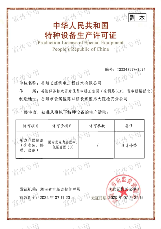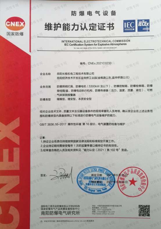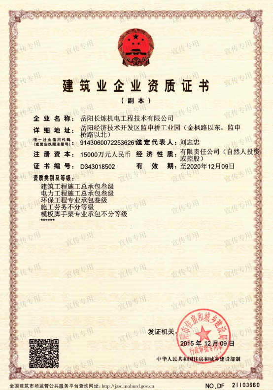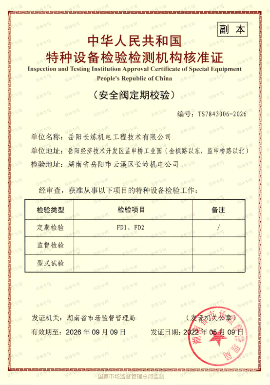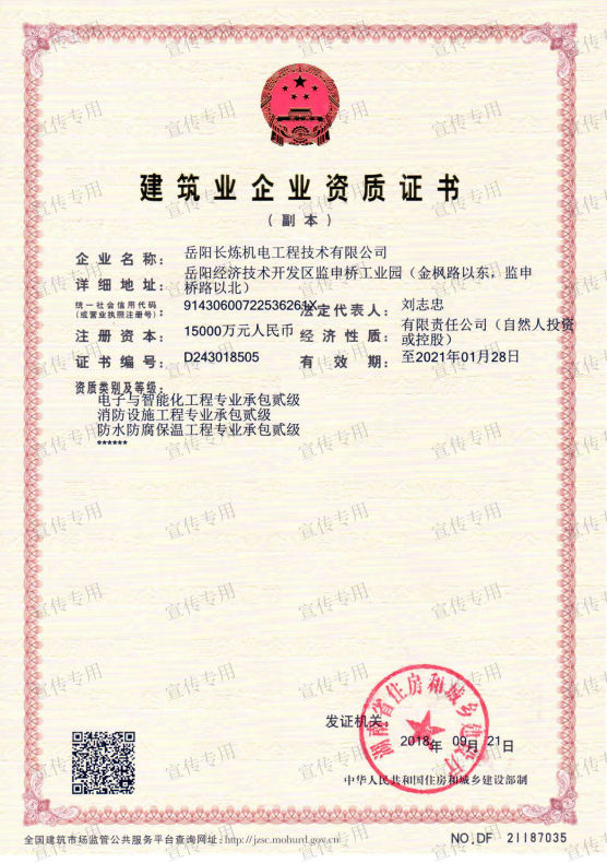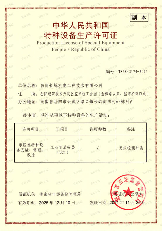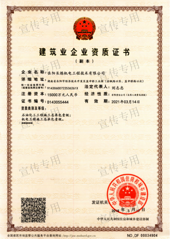 公司擁有石油化工工程施工總承包壹級資質(zhì)、機(jī)電工程施工總承包壹級資質(zhì)、檢維修能力評定(9大類38項)、建筑工程施工總承包叁級資質(zhì)、電力工程施工總承包叁級資質(zhì)、環(huán)保工程專業(yè)承包叁級資質(zhì)、消防設(shè)施工程專業(yè)承包貳級資質(zhì)、防水防腐保溫工程專業(yè)承包貳級資質(zhì)、電子與智能化工程專業(yè)承包貳級資質(zhì)、施工勞務(wù)不分等級資質(zhì)、兩化(工業(yè)化、信息化)融合管理體系認(rèn)證、A級工業(yè)設(shè)備高壓水清洗資質(zhì)、特種設(shè)備生產(chǎn)許可證(中、低壓壓力容器制造(含安裝、修理、改造)(D))、特種設(shè)備安裝改造維修許可證(壓力管道)GC1級、特種設(shè)備安裝改造維修許可證(鍋爐)1級、特種設(shè)備安裝改造維修許可證(起重機(jī)械)B級;特種設(shè)備檢驗檢測機(jī)構(gòu)核準(zhǔn)證(安全閥定期校驗)檢驗項目FD1、FD2、承裝(修、試)電力設(shè)施許可證(承裝類二級、承修類二級、承試類三級)、防爆電氣設(shè)備安裝、修理資格證書、計量標(biāo)準(zhǔn)考核證書的二氧化硫氣體檢測儀檢定裝置、硫化氫氣體檢測儀檢定裝置、熱電偶標(biāo)準(zhǔn)裝置、可燃?xì)怏w檢測報警器檢定裝置、精密壓力表標(biāo)準(zhǔn)裝置、一氧化碳檢測報警器檢定裝置等企業(yè)資質(zhì)。公司通過了中國質(zhì)量認(rèn)證中心QHSE管理體系認(rèn)證,是中石化施工企業(yè)資源庫A庫成員,湖南省建設(shè)網(wǎng)成員單位,湖南省高新技術(shù)企業(yè)。